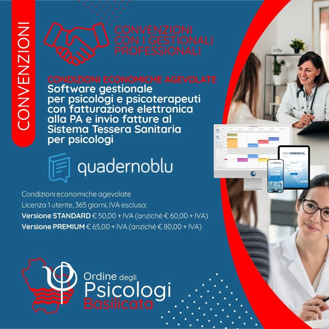 L’Ordine degli Psicologi della Basilicata ha attivato una convenzione con Quadernoblu, software gestionale dedicato a psicologi e psicoterapeuti, pensato per semplificare l’organizzazione dell’attività professionale, dalla gestione degli appuntamenti alla fatturazione elettronica, fino all’invio dei dati al Sistema Tessera Sanitaria.
