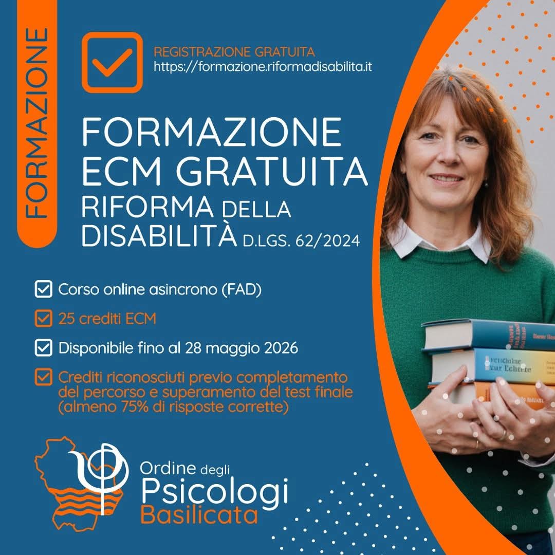 L’Ordine delle Psicologhe e degli Psicologi della Basilicata informa gli iscritti che è disponibile un corso di formazione ECM gratuito in modalità FAD asincrona, dedicato alla Riforma della Disabilità (D.Lgs. 62/2024).